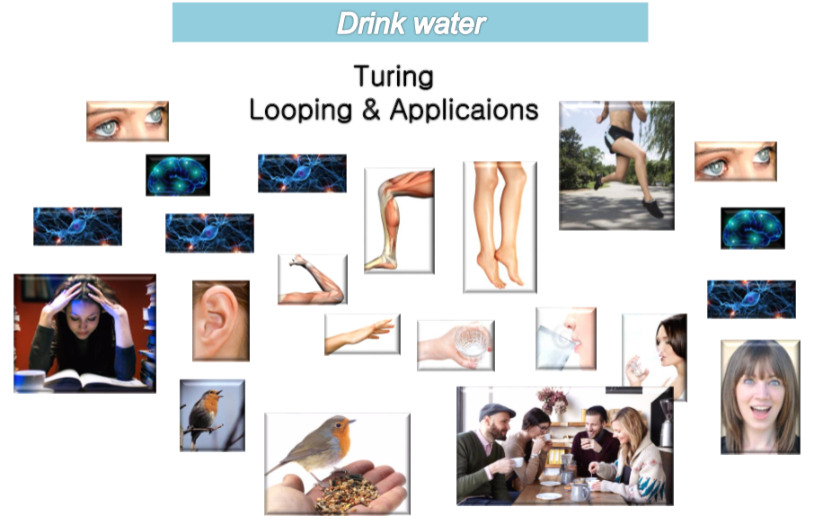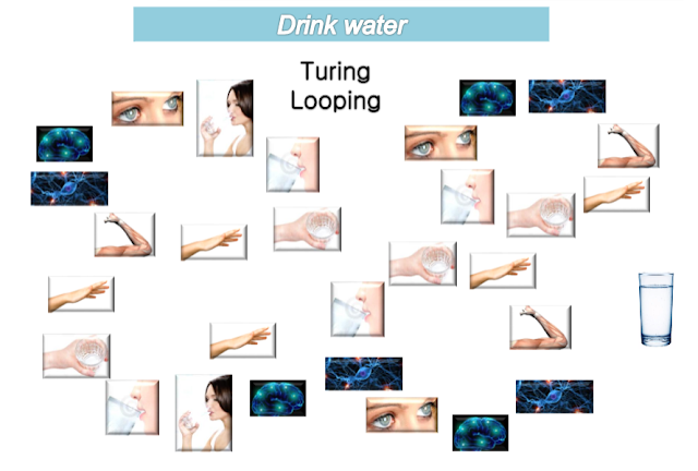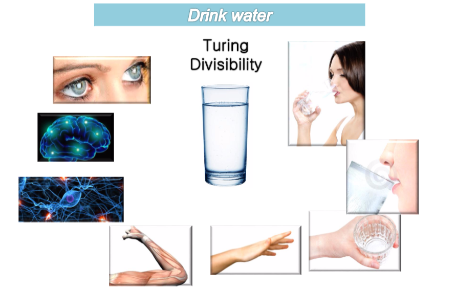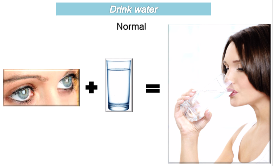당신은 목마름을 느낀다 > 안구로 물을 존재를 확인한다 > 뇌에서 명령을 내리기 위한 전기스파크가 인다 > 해당 전기자극이 뇌의 뉴런과 시냅스를 거쳐 뻗어나간다 > 근육과 힘줄은 해당 명령을 수신한다 > 목표물체를 향해 손을 뻗는다 > 손을 뻗어 컵을 잡고 입 근처로 끌어온다 > 끌어온 컵을 향해 입을 벌린다 > 컵과 입의 각도를 조절하며 컵 안의 물을 입안으로 흘려 보낸다 > 인후(목구멍)는 들어오는 물을 꿀꺽꿀꺽 삼킨다