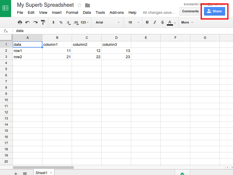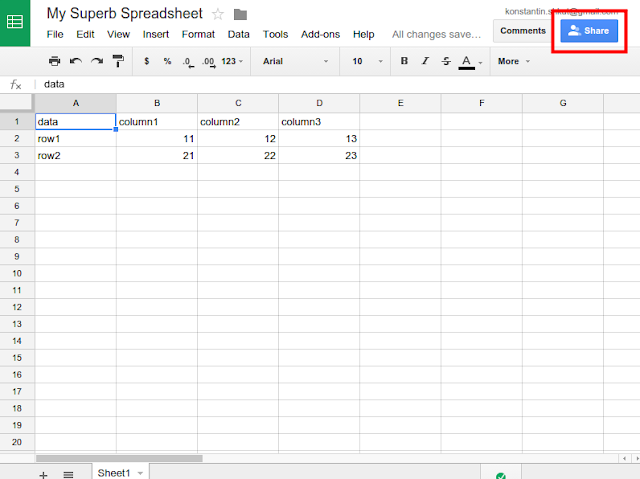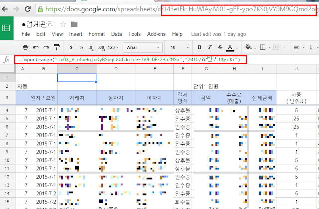 MS오피스와 달리 구글드라이브만이 가지는 특장점은 여러가지가 있겠지만, 그 중 하나는 아주 쉬운 불러오기 기능(Data Import)이다. 데이터가 웹싸이트의 html이든, xml이든, url로 이루어진 API서비스이든 심지어 완전히 다른 시트에 있는 내용까지도 매우 손쉽게 불러올 수 있다는 것이다. 구글의 각시트는 아래 붉은 상자에서 볼 수 있는 것과 같이 고유판 ‘파일키’를 가지고 있다. 이는 구글드라이브 안에서 하나씩만 존재하는 일종의 영구링크(퍼마링크: Permalink)이다. 이러한 링크를 통해 그 어떠한 시트에서건 원하는 대로 자료를 가져올 수가 있으며 이는 역시 실시간으로 변경사항이 반영되고 공유된다.