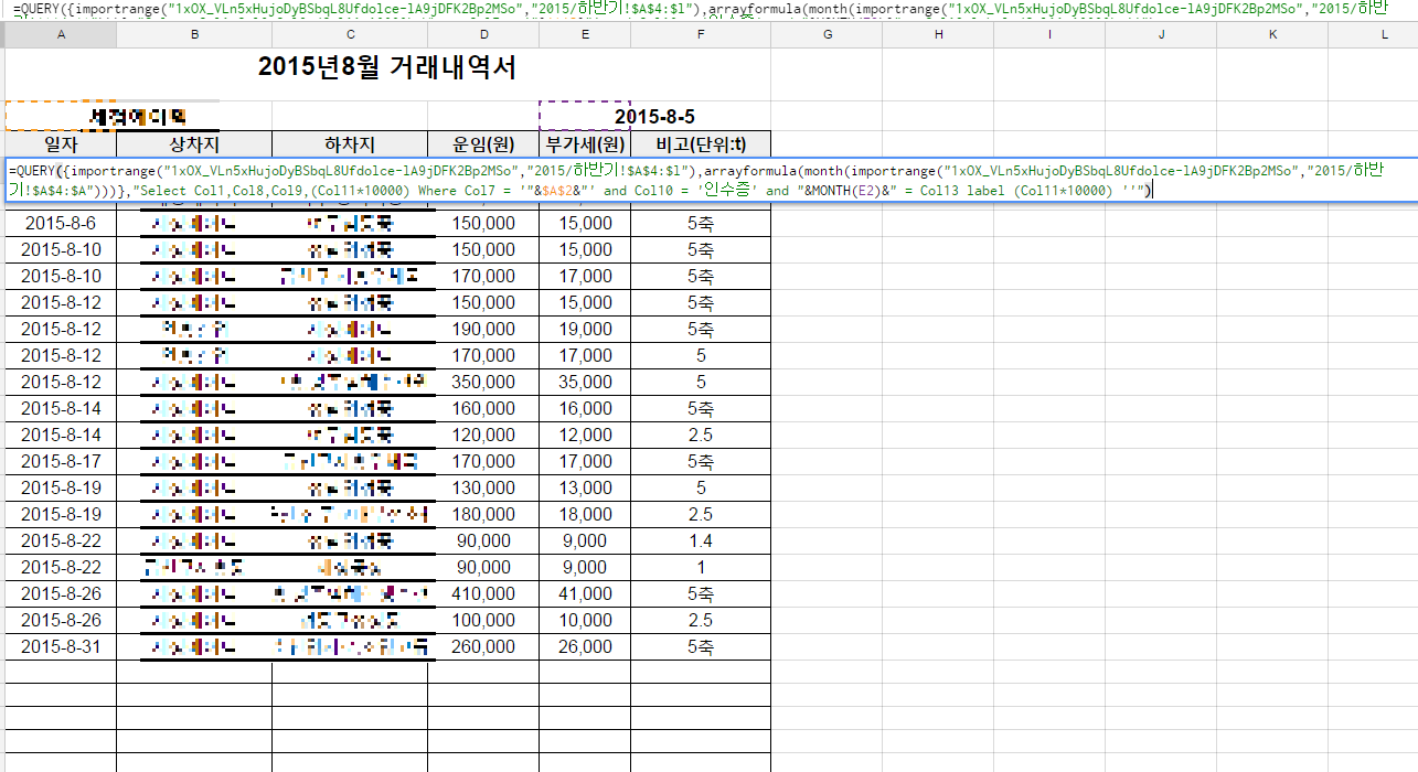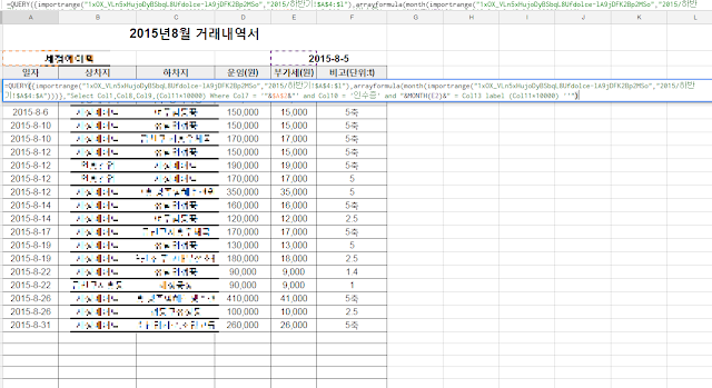 그 중, 단연 압권은 쿼리(Query)문인데 이는 MS오피스의 ‘엑세스’에 비할 수 있다. 물론 개인적으로는 쿼리가 훨씬 쉽고 강력한 도구라고 생각한다(컴맹을 간신히 벗어난 본인이 다룰 수 있을 정도이니..분명히 쉬운 언어이다). 아래는 퀴리로 구현된 거래내역서이다. ‘작성일자’을 입력하면, 입력 월에 해당하는 모든 거래내역이 자동으로 입맛에 맞게 전시된다. 일일이 복사 붙여넣기를 할 필요가 없으며, 이것이 실시간으로 구성원 모두에게 공유된다는 점이 구글드라이브 ERP가 강력한 이유이다.