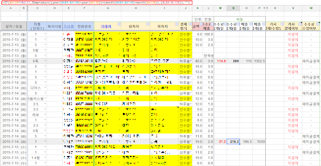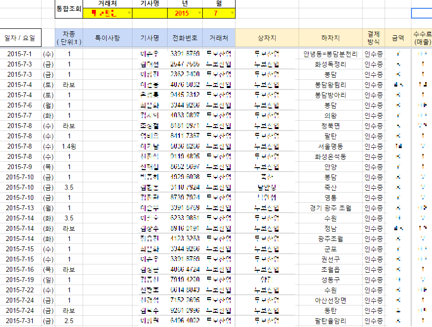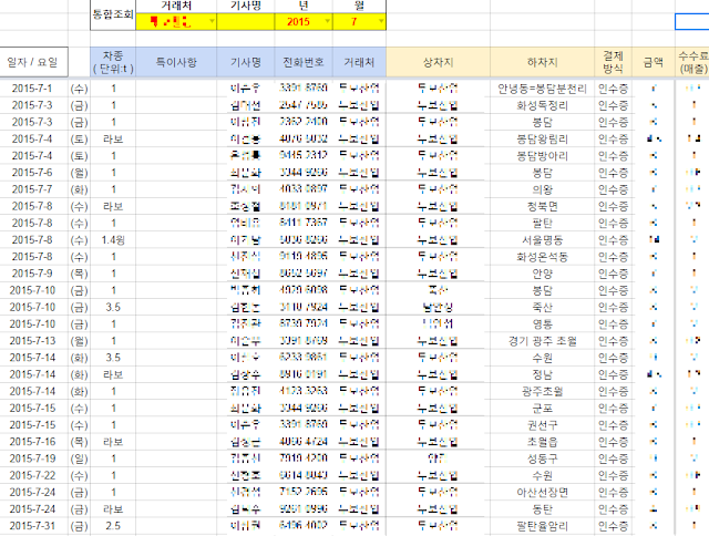 이를 조금 더 응용하면, 아예 업체를 바음껏 바꾸어 가며, 월별로 거래내역을 조회하는 것도 가능하다. 리스트에서 ‘거래처/기사명/년/월’을 통해 실시간 검색 및 자료조회가 가능하다. (아래)