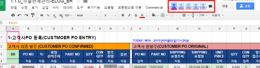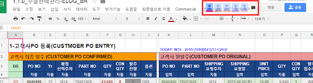 공유가 되면 공유된 사용자들이 동시에 접속하여 동기적으로 작업하는 것이 가능하다. 아래의 붉은 테두리를 보면 총 5명의 사용자가 해당 시트에 접속하고 있다는것을 알 수 있다. 무엇을 누가 수정하였는지 표시가 되며, 수정 시바다 백업파일이 저장되기 때문에 롤백(이전 시점의 저장된 파일로 돌아가는 것)도 용이하다. 채팅기능으로 실시간 채팅도 가능하다.
