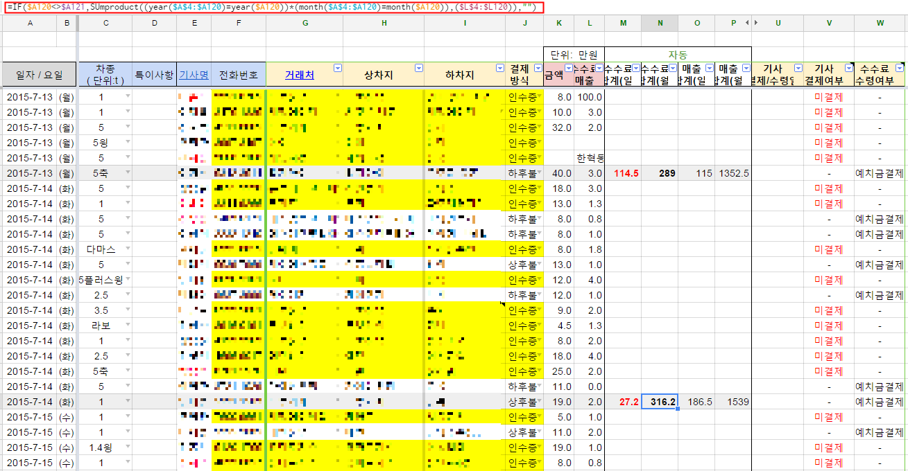매일의 내용을 입력하면 자동으로 수수료 및 매출내역이 일별/월별로 합계가 되며 거래의 형태에 따라 어떠한 방법으로 정산을 해야하는지 그리고 맞는 일자에 정산이 되었는지 알림을 만드는 것이 가능하다. <특정한 일자까지 결제일에 날짜를 입력하지 않는 경우, 결제일이라고 알림메일을 보내는 식이다. 이는 스크립트를 사용하면 가능하다.> 또한 등록된 인적자원의 경우, 이름을 적으면 전화번호/차고지/주소 등 필요한 정보를 자동으로 끌어온다.