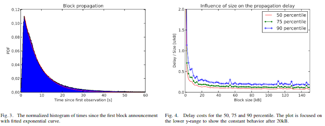 따라서 1차에서는 25%의 속도차이가 나던 것이, 2차에 가서는 50%, 3차에서는 100%, 4차에서는 200%가 되는 식의 기하급수적인 전송속도 차이를 보인다. 이러한 네트워크가 블록을 전파하는 시간 때문에 발생하는 지연이 자주 언급되는 ‘네트워크 지연속도(latency of network)’이다. 이러한 지연속도의 영향을 줄이고자 적절하게 고안된 것이 비트코인 블록의 10분 주기이다. 주기가 너무 길면 실생활에 사용되기 어렵고, 주기가 너무 빠르다면 지연속도의 영향이 너무 커진다.